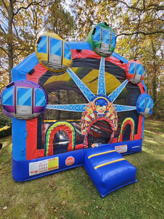 A carnival-themed inflatable that looks like a Ferris wheel, the Ferris Wheel Bouncer offers a bright, roomy jump area kids love. Mesh sides keep air flowing and visibility high, and the soft entrance step makes getting in and out easy.